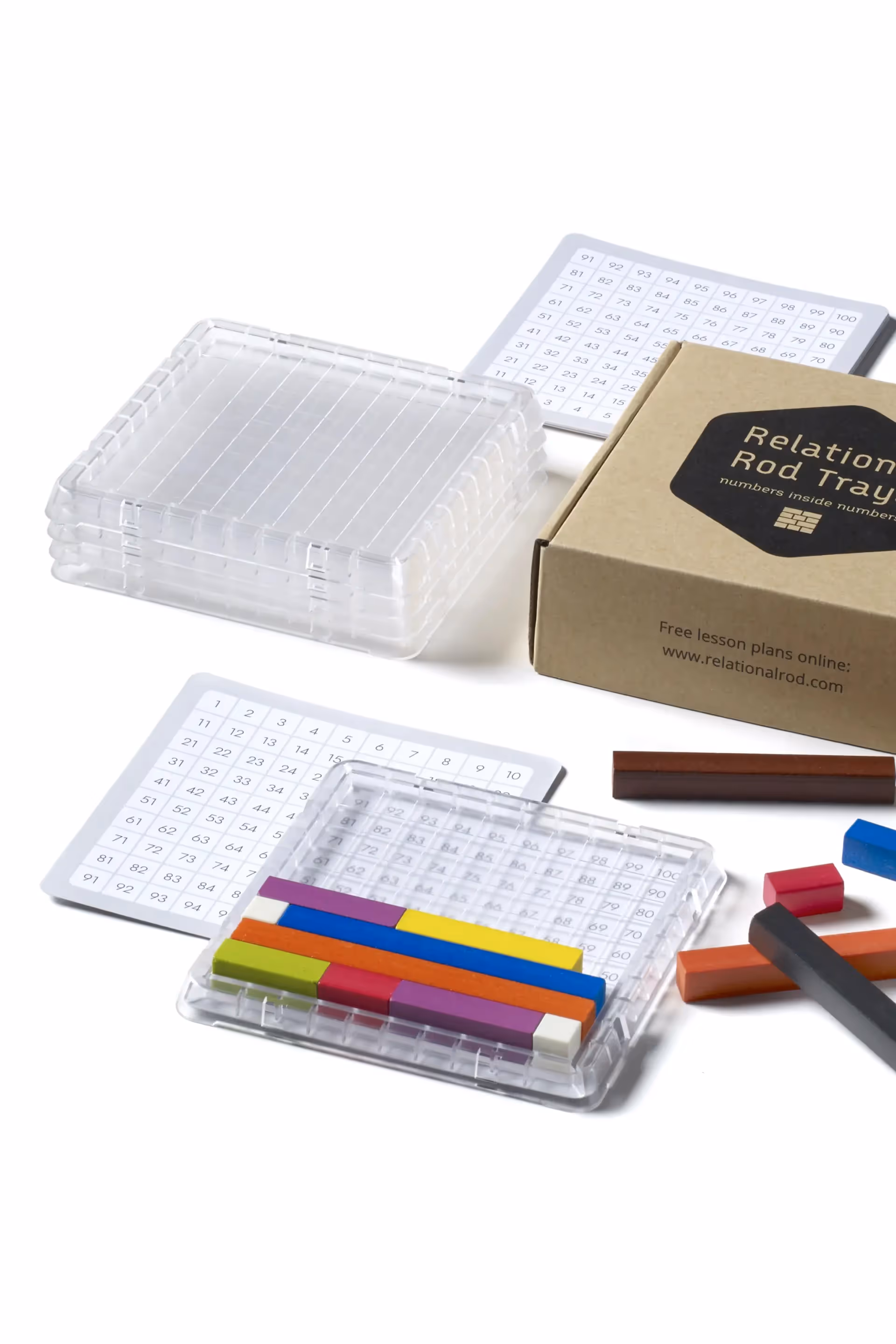 Educators have been using Cusinaire rods with paper 'hundreds charts' for years, however they come with their own set of challenges: they don't always print exactly 10cmx10cm so rods don’t fit, young students don't always understand where the edges of the hundreds chart are, and treating this paper as disposable adds up to a waste over the years! We designed and manufactured a low-cost, impact resistant, injection molded Relational Rod Tray that fit Cuisenaire-style Rods. They include swappable card inserts, catering to a variety of teaching styles. Some educators want a blank tray, a counting up hundreds chart tray, a counting down hundreds chart tray, and a customizable hundreds chart tray. Relational Rod Trays support the development of number sense through the exploration of mathematical concepts such as relationships between numbers, composing and decomposing numbers, working with patterns, additive reasoning, square numbers, properties of odd/even numbers, fractions, measuring, symmetry, and many more!